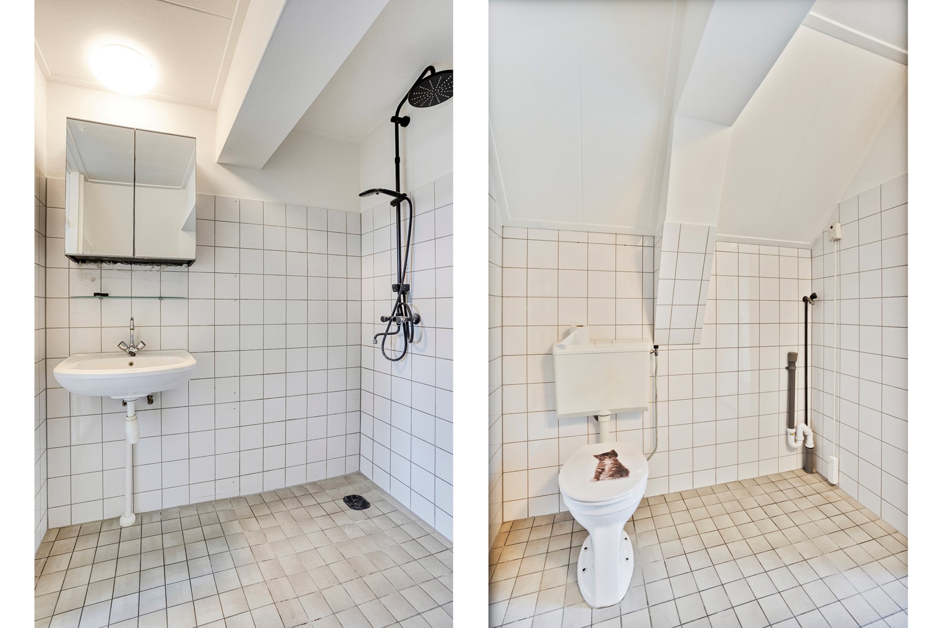 Aan de voorzijde heb je de ruime slaapkamer met vaste kastenwand en toegang tot de badkamer met douche, wastafel en toilet.