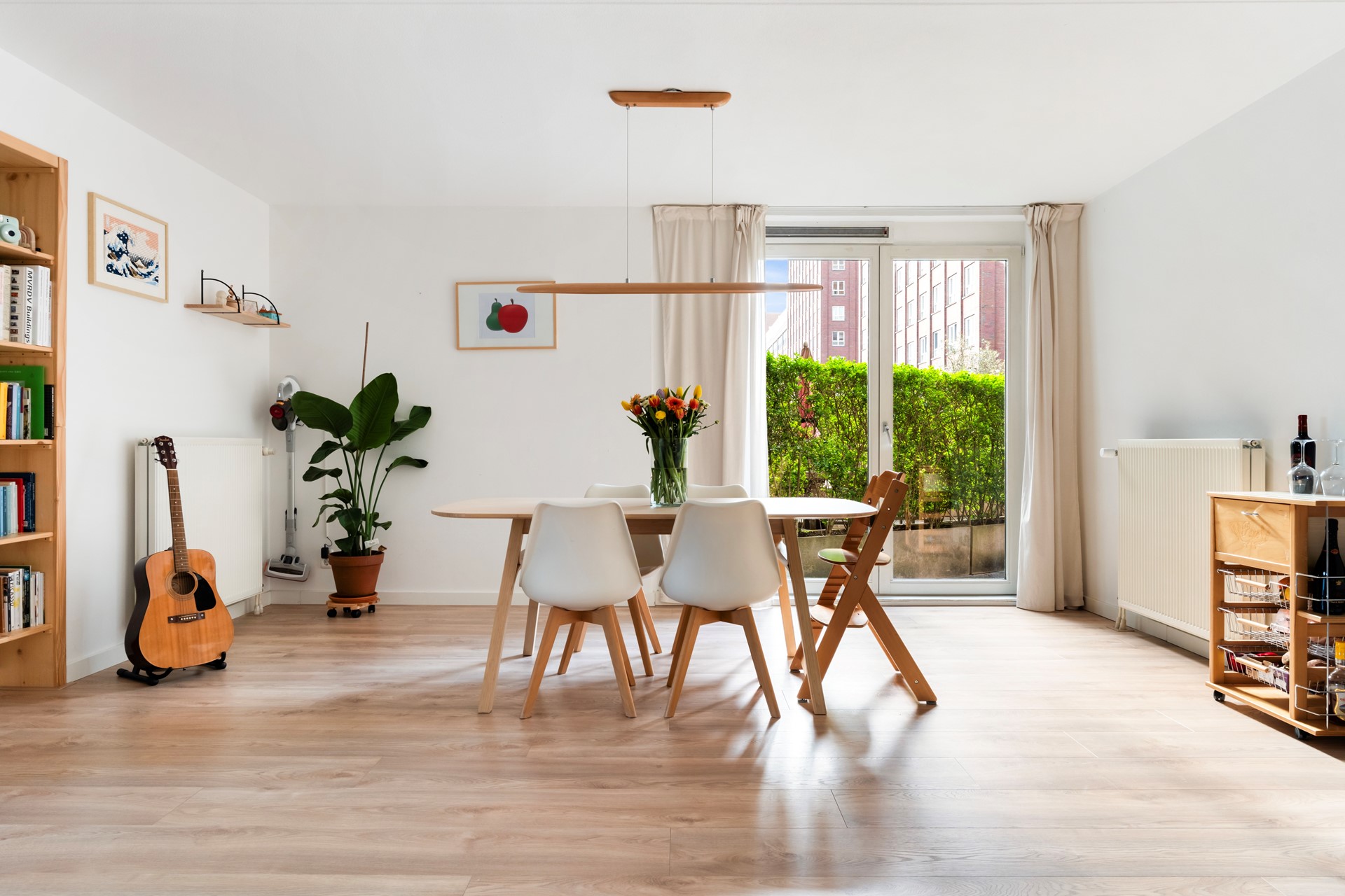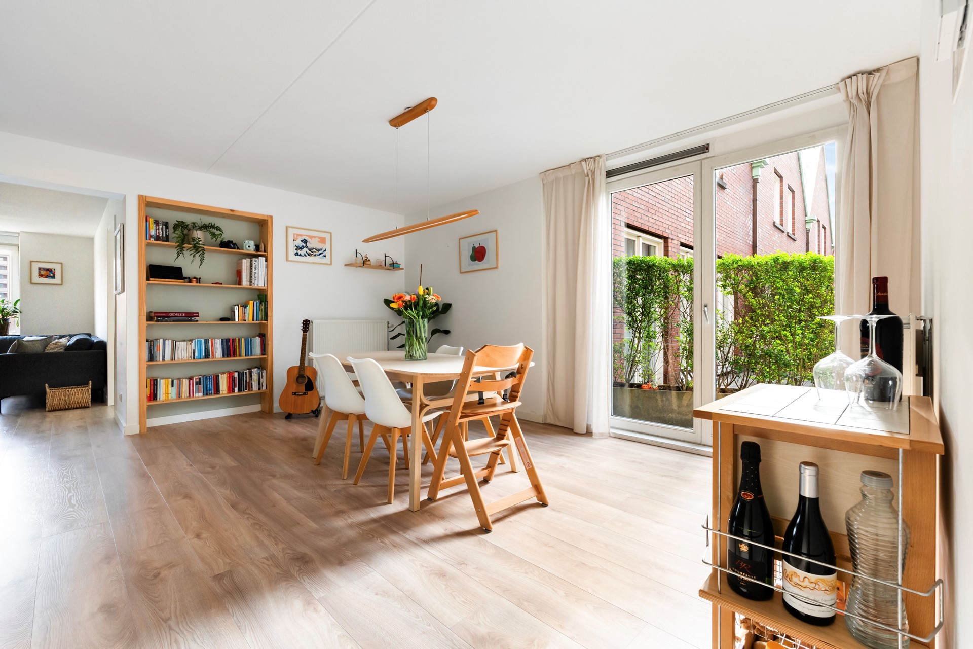 De woonkamer is heerlijk licht dankzij de grote raampartijen over de volledige breedte. Dit zorgt voor een prettige, open leefruimte waar je je direct thuis voelt.