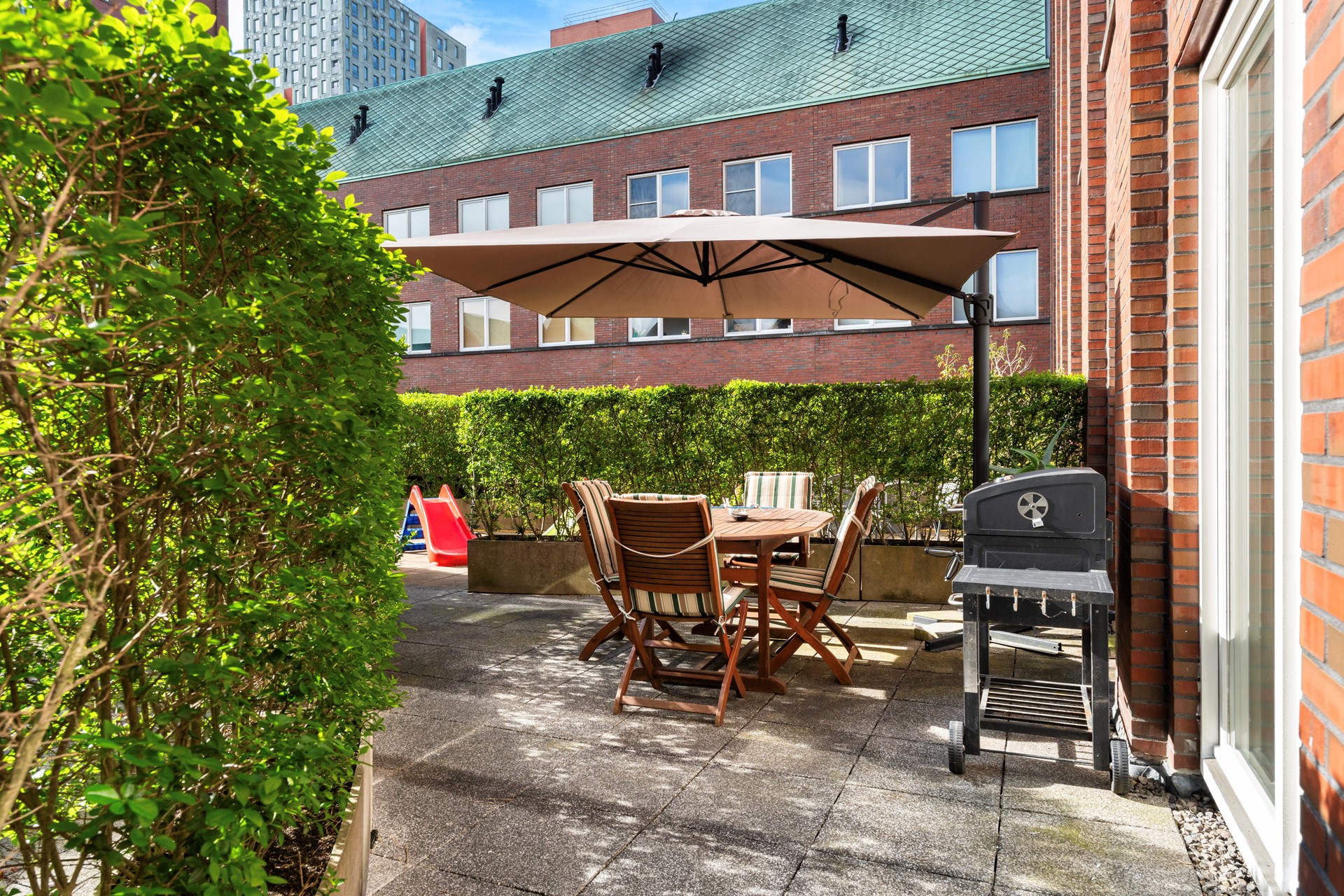 De tuin grenst aan een gezamenlijke binnentuin, wat zorgt voor een groen en rustig gevoel midden in de stad.